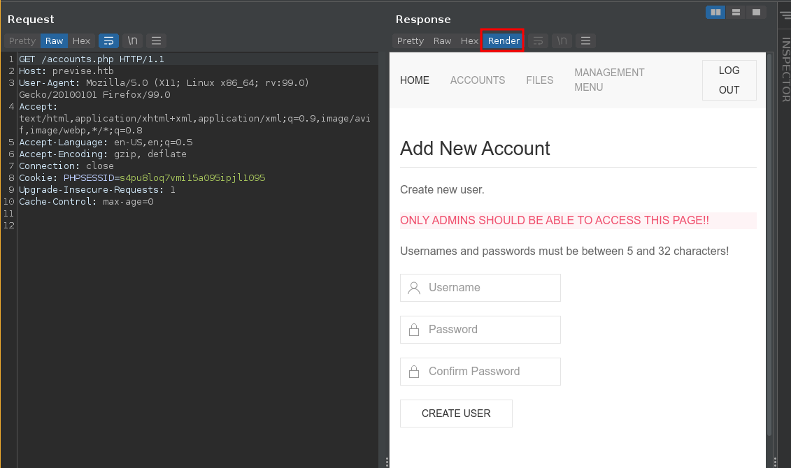 Now let's visit http://previse.htb/accounts.php and intercept it with burpsuite: