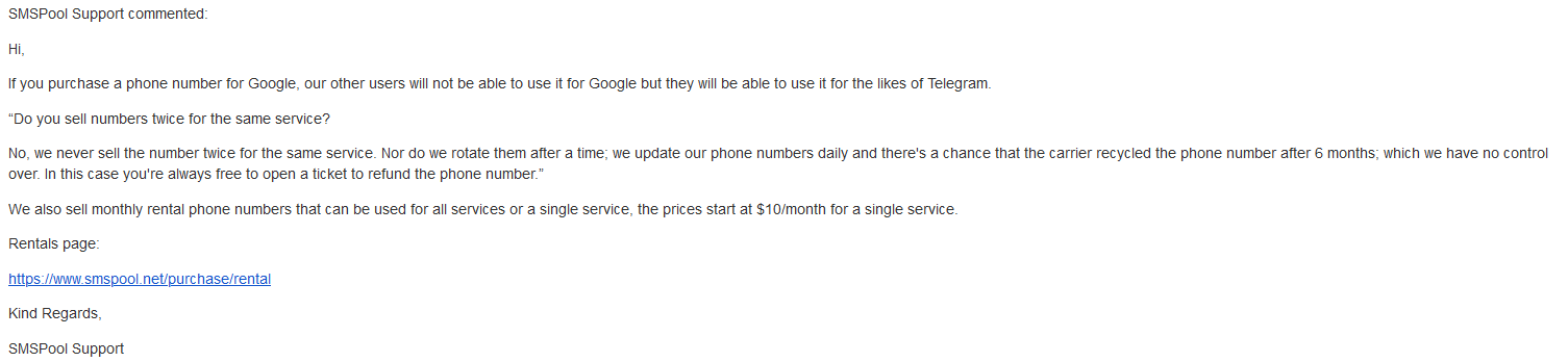 Simply complete the remaining steps onscreen and voilΓ ! If prompted for an email address, alias addresses from SimpleLogin will do the trick despite the onscreen warning from SMSpool about disposable email addresses not working. SMSpool doesn't reuse phone numbers for the same service so the number you purchased for Telegram will not be resold to anyone else signing up for Telegram. They also do not rotate phone numbers after a period of time has passed. However, it is possible that upstream carriers may recycle numbers after some 6 months and this is something that SMSpool does not have control over. Sauce