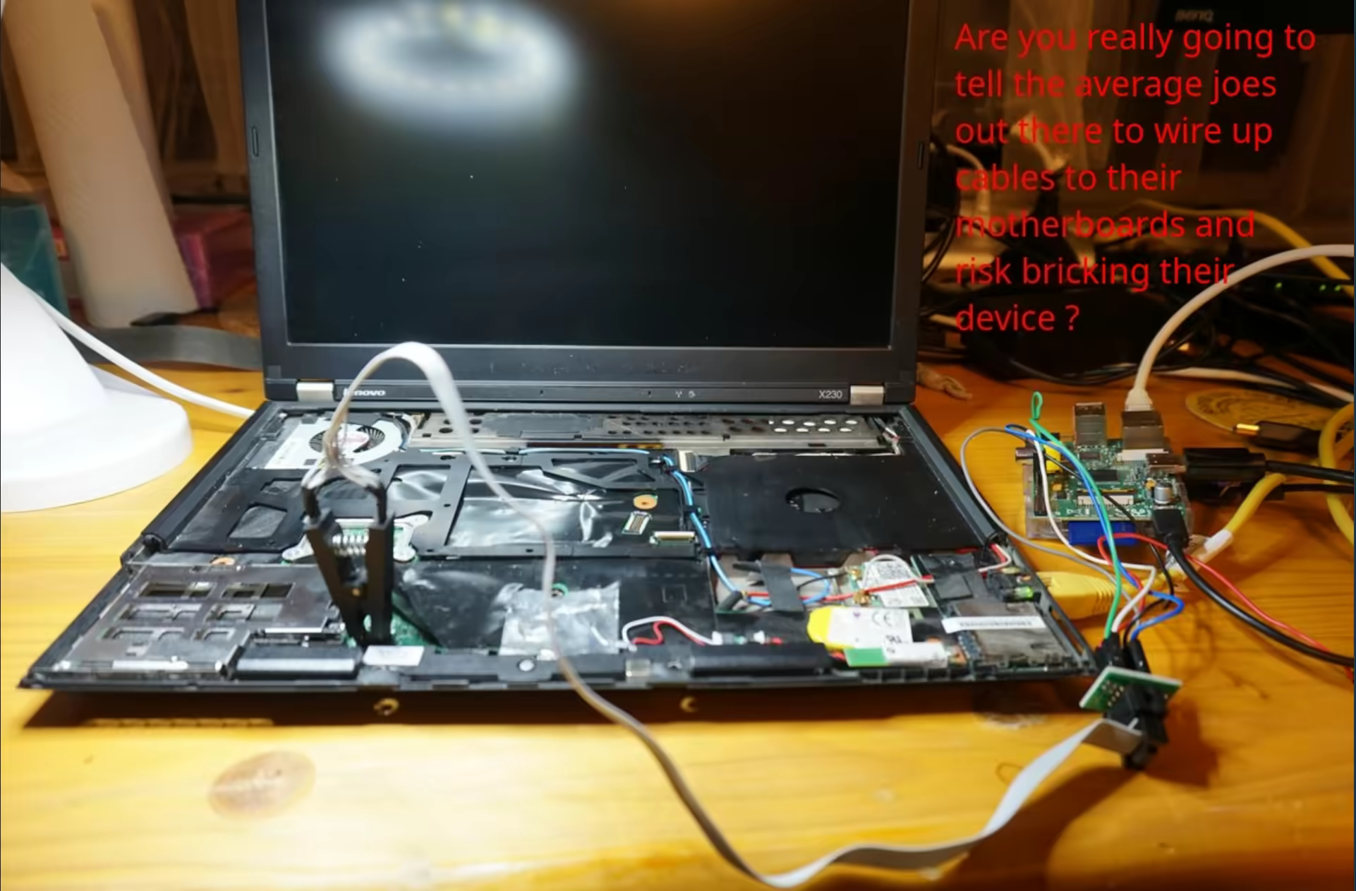 No, we won't recommend to the 90% average joes out there to wire up cables to their CPU in order to disable intel ME, install coreboot, or whatever else, and risk bricking their motherboards/CPUs permanently.