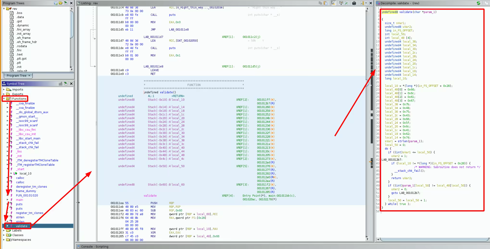 now here we see something, first of all it does a scanf (to prompt for our input) and then moves our text into pvVar2, then, it calls a function called 'validate' and the result of that function gets put into iVar1 which determines if we get a correct answer or not. So let's inspect the 2 possibilities of the if statement: