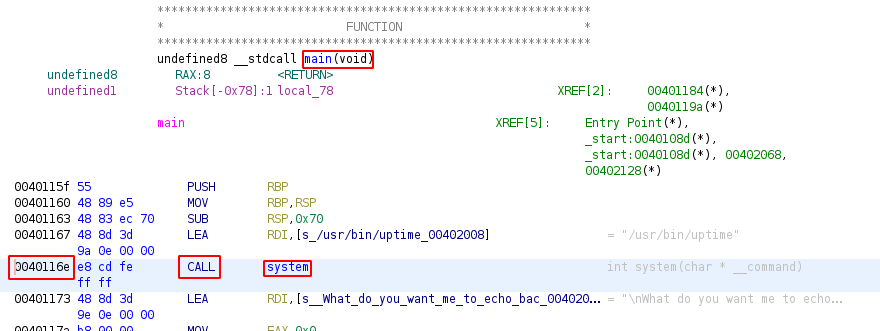 in ghidra still, we check what is the system()'s memory address