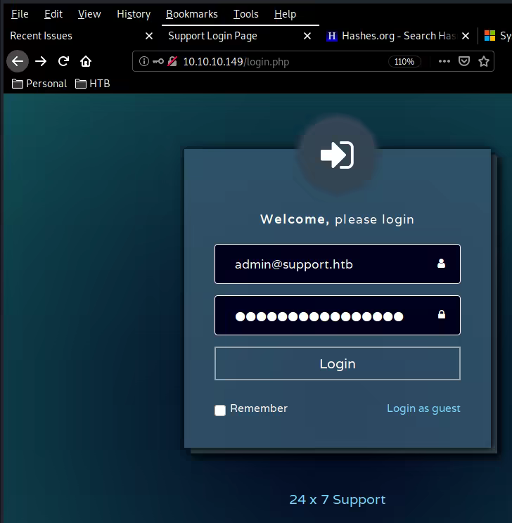 localhost/login.php?login_username=admin@support.htb&login;_password=4dD!5}x/re8]FBuZ&login;=