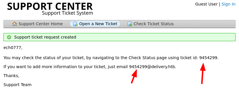 here we are hinted towards the domain name helpdesk.delivery.htb so let's add both the domain name and the subdomain to our hosts file: