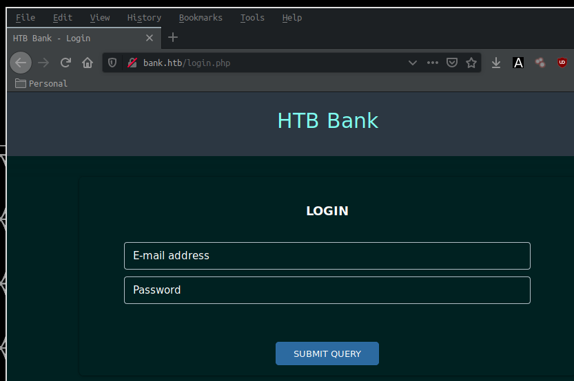 Once we browse to the new alias bank.htb , we see that it finally redirects us to the login page login.php that our nmap scan picked up.
