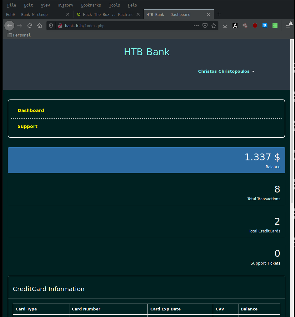 We now have credentials to work with : chris@bank.htb : !##HTBB4nkP4ssw0rd!## We will try them onto the login page that our nmap scan picked up before.