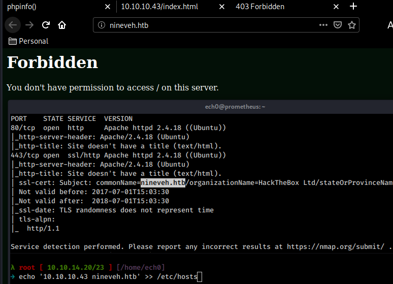 So now we know the box is running php version 7.0.18 on apache2.0. Before our nmap scan picked up the domain name nineveh.htb so let's add it to our /etc/hosts file.