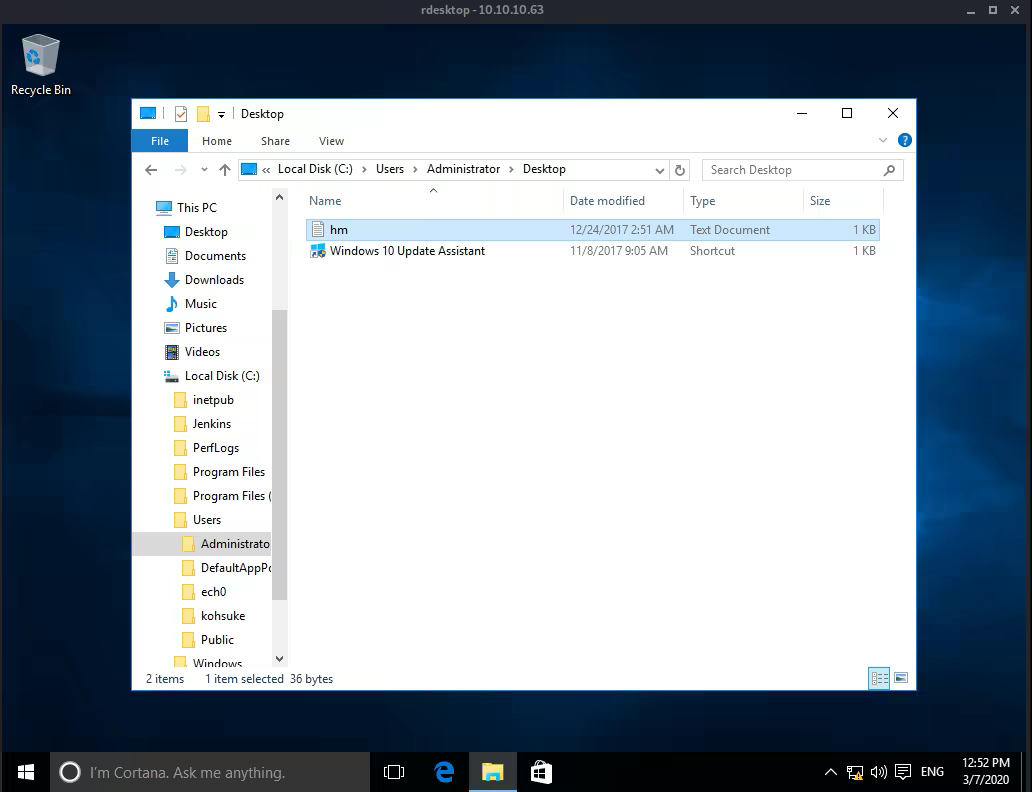 Once we're connected, we head over to kohsuke's desktop to copy the user flag on our desktop, to be able to print it :