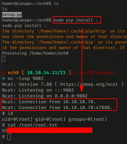 then we use pip to execute our malicious setup.py file, and we catch the incoming reverse shell connection using netcat: