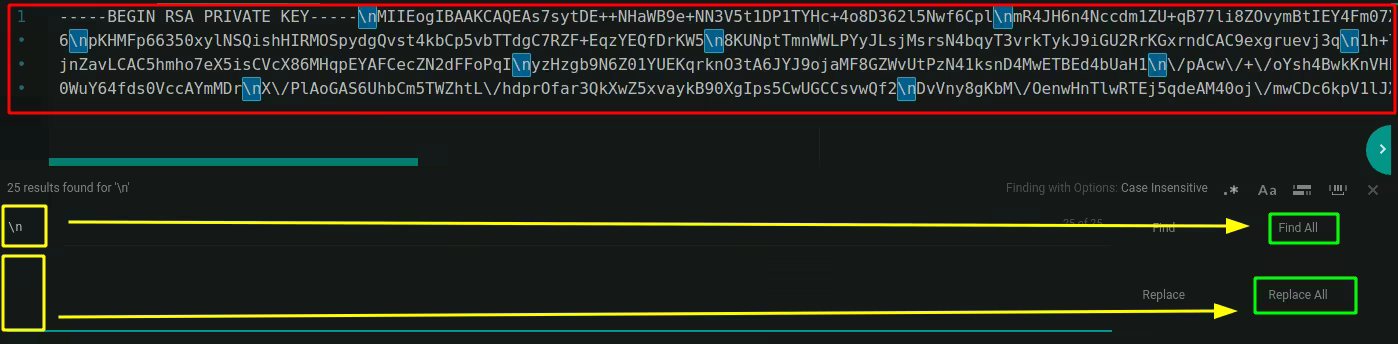 And we have a private ssh key ! now let's save it locally, and we need to transform the \n into new lines, remove the remaining \, give it the appropriate permissions and then use it to log in via ssh: