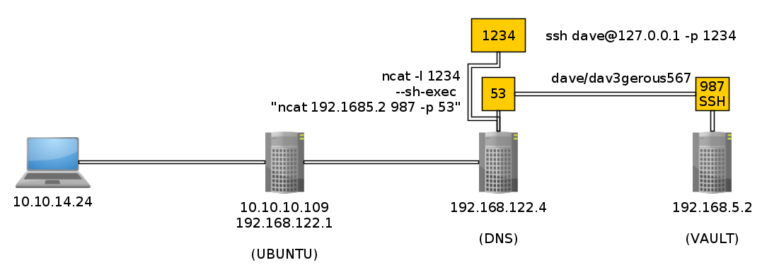 dave@DNS:~$ sudo /usr/bin/ncat -l 1234 --sh-exec "ncat 192.168.5.2 987 -p 53" & sleep 5 && ssh dave@localhost -p 1234