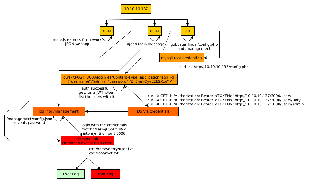 β curl -XPOST http://10.10.10.137:3000/login -H 'Content-Type: application/json' -d '{"username":"root","password":"Zk6heYCyv6ZE9Xcg"}'