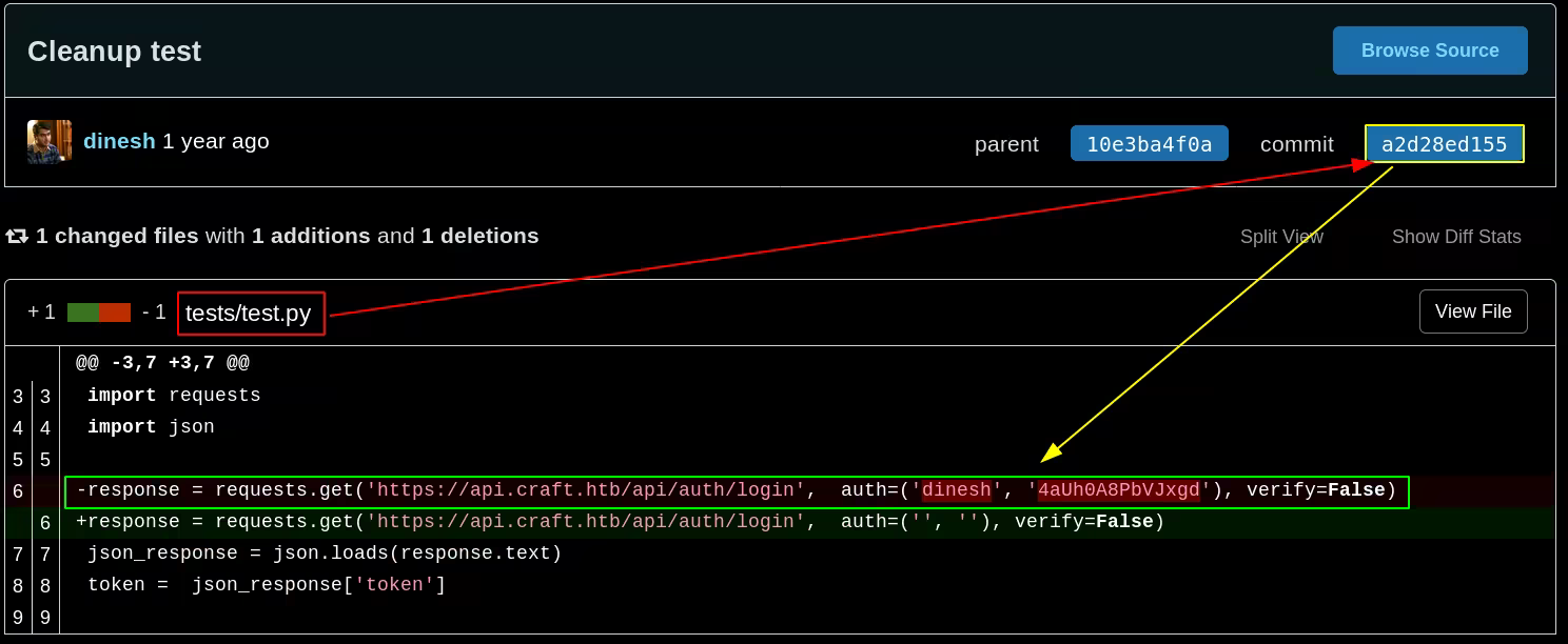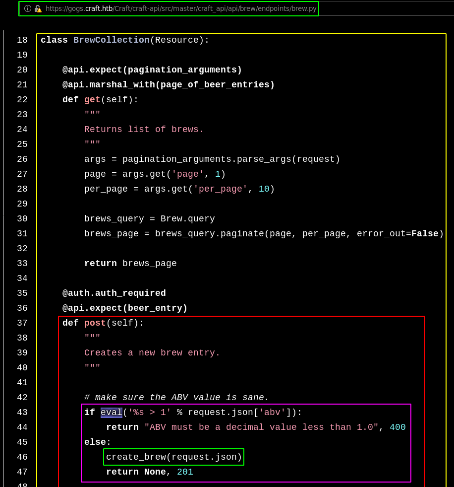 response = requests.get('https://api.craft.htb/api/auth/login', auth=('dinesh', '4aUh0A8PbVJxgd'), verify=False)