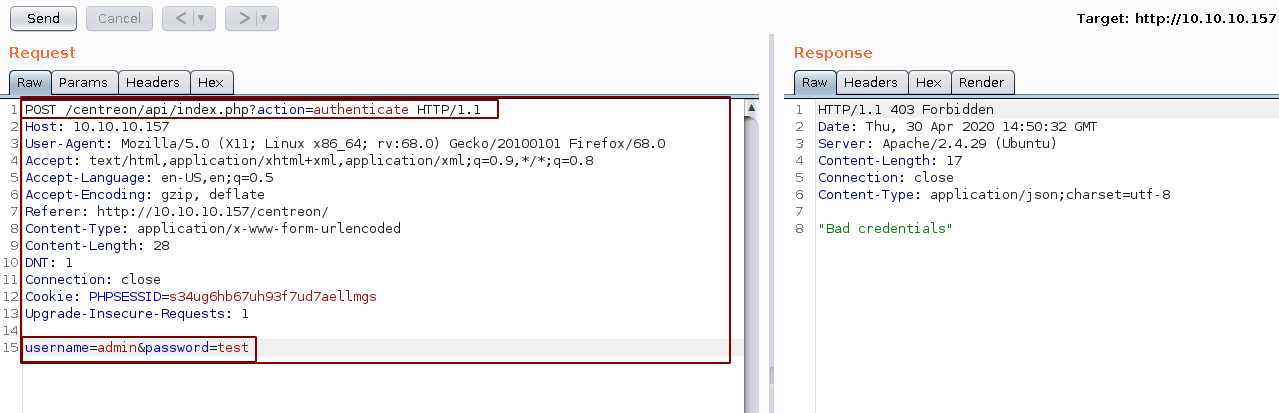 β curl 10.10.10.157/centreon/api/index.php?action=authenticate -d 'username=admin&password;=test'