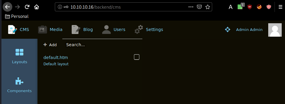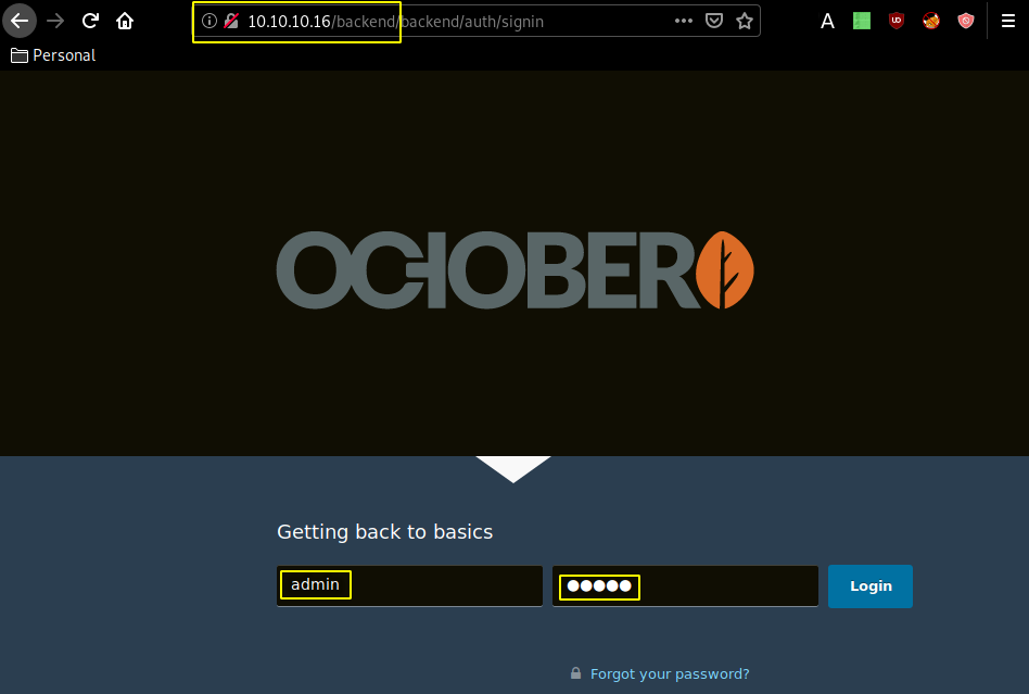 Our nmap scan picked up port 80 running the October CMS on Apache, which is based on the php laravel framework. let's check out the /backend default administrator login page with the default credentials admin:admin: