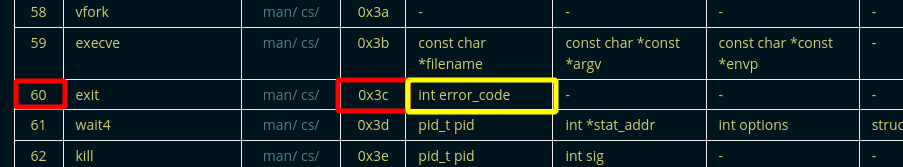 Now if you want to use syscalls, you first need the ID of the syscall and then you must know what arguements to give it, But you also need to know which registers correspond to the ID and to the arguements, so remember this table right here: