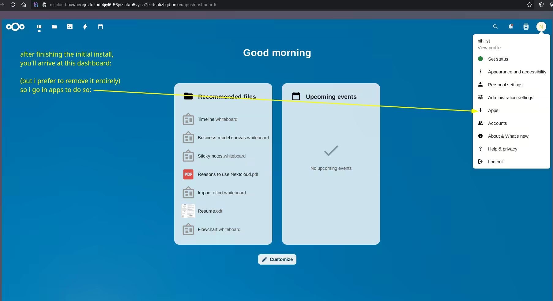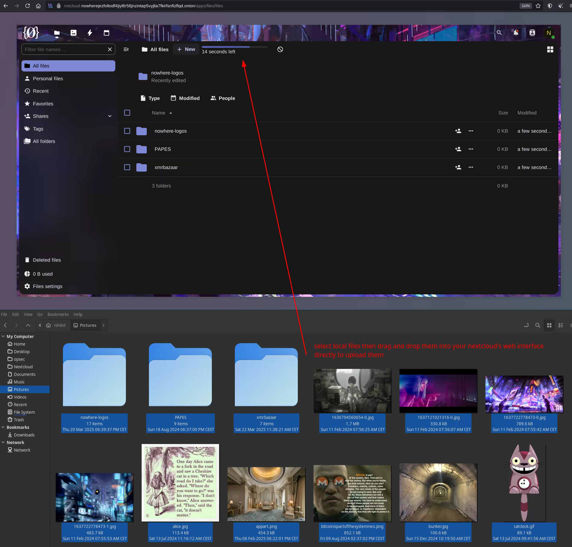 And that's it! You now have a nextcloud instance working via .onion to easily save your files remotely.