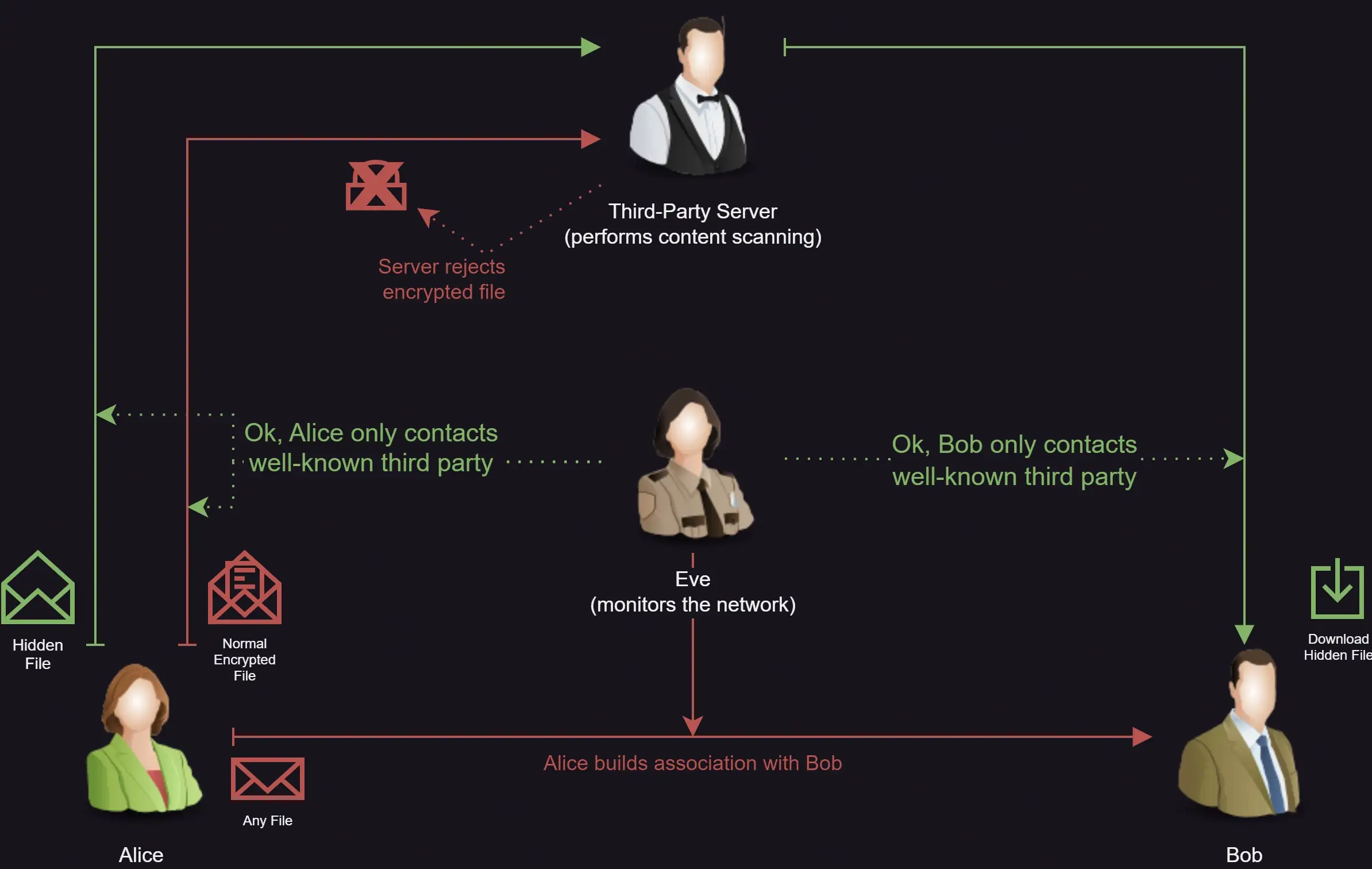 However, some form of communication event must always occur , so steganography exploits various side-channels in order to embed additional concealed data. In order to thwart analysis of metadata, communicate through one or multiple uninvolved third party dead-drops , preferably such with broad distribution (i.e. popular websites, like social media or message/image boards).