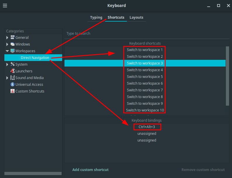To make accessing each workspace easier and faster, i configured shortcuts: