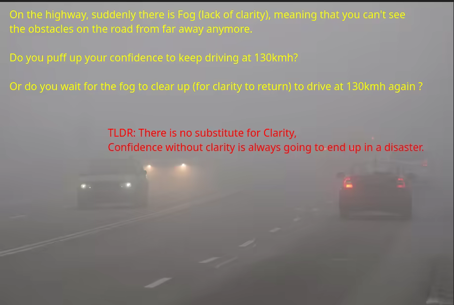Confidence is not a substitute for clarity. In fact there is no substitute for clarity. You anyway have to adapt your speed of driving to the extent that you have clarity of the road ahead. Without clarity you have to drive slowly, it is only with enough visibility that you can drive faster safely.
