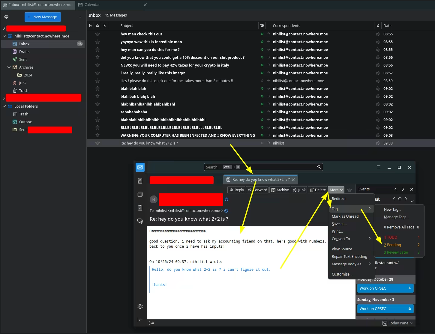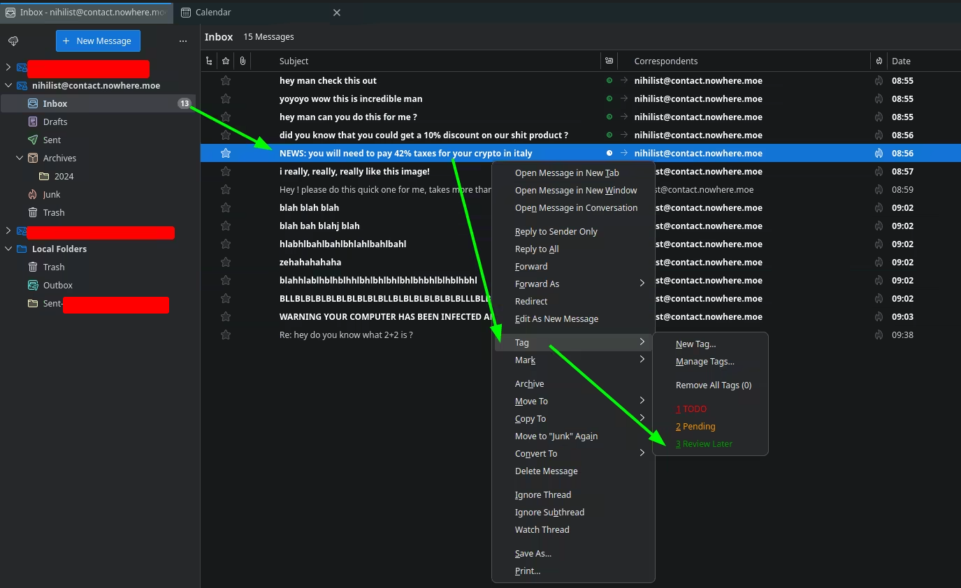 Once all emails are marked properly, you have this result, with visual cues as to what you are waiting for, what you need to do, and what you need to review later: