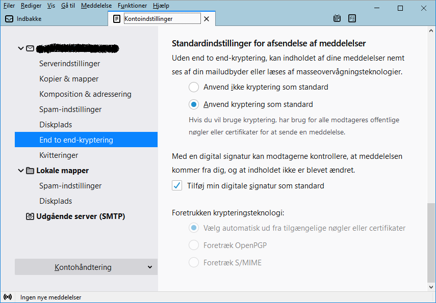 Hermed vil e-mails du modtager blive vist som ren tekst, og ikke HTML. Det er generelt en god ide at slå HTML fra, både i programmer som Thunderbird og i webmails som Hotmail, Gmail osv. HTML giver en række “smarte”, men som regel også unødvendige funktioner i e-mails, såsom at vise grafik og levende billeder. At have HTML slået til i emails er som regel ikke nødvendigt, og udgør samtidig en privacyog sikkerhedsrisiko flere forskellige måder. Det kan ligefrem gøre det muligt for en hacker at aflæse dine krypterede emails. Desværre er der kommet flere og flere virksomheder der udsender emails som kun kan læses med HTML slået til. Derfor er det praktisk at du husker dette punkt, så du kan slå HTML midlertidigt til, når du engang imellem får brug for det, og vælger at løbe risikoen. Når du slår HTML til, så brug så vidt muligt Simpel HTML frem for Original HTML. Jo mere simpelt noget er, jo mere sikkert er det ofte.