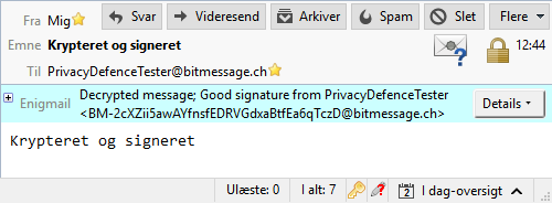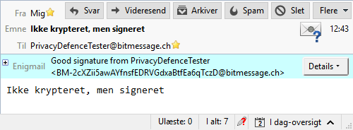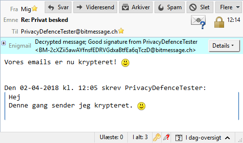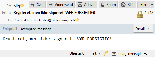 Denne e-mail er både sikret imod at uvedkommende læser med, at fremmede udgiver sig for at være en af dine venner, og at være blevet ændret undervejs. Det er denne type e-mail du gerne skulle sende og modtage fremover, når du skriver fortrolige beskeder. Så check altid at Enigmail skriver Decrypted message; Good signature.