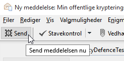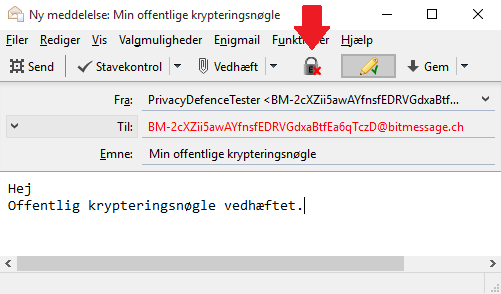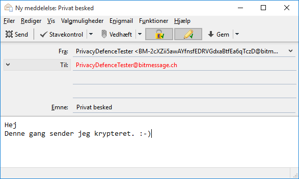 Du er nu klar til at skrive krypteret med dine venner og bekendte som også har fulgt vejledningen. Bemærk at med indstillingerne i denne vejledning, er kryptering og signering slået til som standard. For at skrive en almindelig, ukrypteret email, skal kryptering og signering slås fra, ved at klikke på knapperne med henholdsvis en hængelås og en blyant, som vist her til højre.