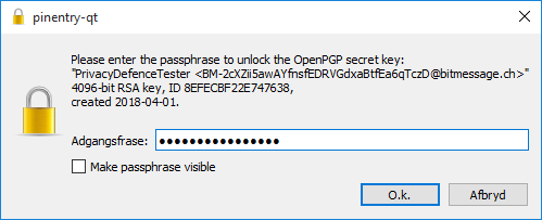 Din adgangskode vil blive husket af GnuPG i 5 minutter. I de 5 minutter skal den derfor ikke indtastes igen selv om der bliver brug for den.