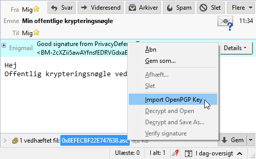 1. I den modtagne email: Højreklik på vedhæftningen og vælg Import OpenPGP Key.