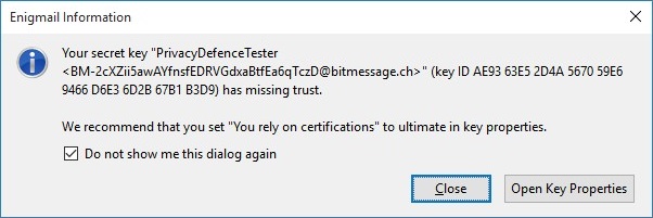 Vil man være helt sikker på at det er den rigtige krypteringsnøgle man har modtaget, og at den ikke er blevet ændret undervejs, så skal man gemme krypteringsnøglen og gå til Enigmail–>Key Management. Højreklik på krypteringsnøglen og vælg Key Properties. Hvis feltet ud for Fingerprint er ens hos afsender og modtager, så er nøglen præcis den samme, og dermed ikke ændret undervejs. Sammenlign fingerprintet ved at læse et par af tallene op over telefonen. Det er ikke nødvendigt at læse det hele op, for hvis krypteringsnøglerne hos afsender og modtager er blot den mindste smule forskellige, så er fingerprintet helt forskelligt.