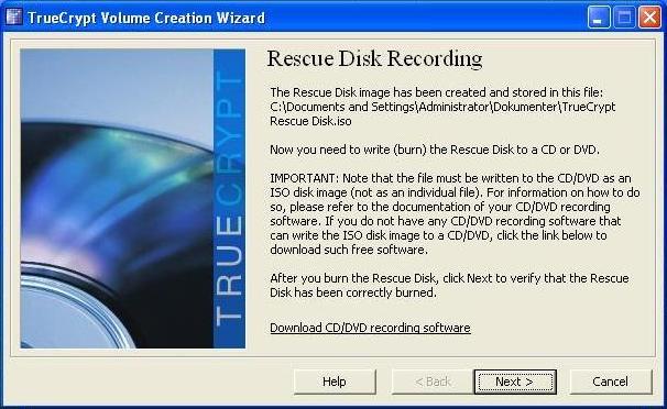 TrueCrypt gør meget for, at intet skal kunne gå galt under krypteringen. En af de ting der gøres er, at man skal brænde en CD, en såkaldt Rescue Disk. Efter krypteringen er der en ganske lille del af harddisken, hvor TrueCrypt har sin såkaldte bootloader liggende. Rent teoretisk kunne det ske, at denne del af harddisken blev beskadiget eller overskrevet med anden data. Det ville medføre, at styresystemet ikke kunne starte, at alle data ville være tabt, og at Windows skulle geninstalleres. For at undgå den situation, er man nødt til at brænde en Rescue Disk, der kan bruges til at starte Windows fra, hvis uheldet er ude. Man får sandsynligvis aldrig brug for den, men den er vigtig at gemme for alle tilfældes skyld. Og der er ikke umiddelbart nogen risiko forbundet med, hvis nogen får fat på den, for den kan kun bruges sammen med harddisken og det rigtige password.