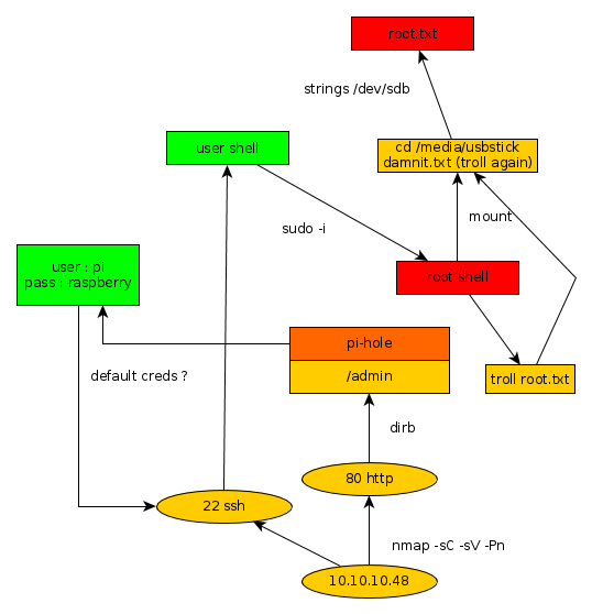We see that the box seems to be running a the Pi-Hole service, which is basically a DNS loophole to avoid getting ads. We can suppose that the box may have misconfigured his ssh, and perhaps left the default user and password. which could potentially be using th credentials pi:raspberry