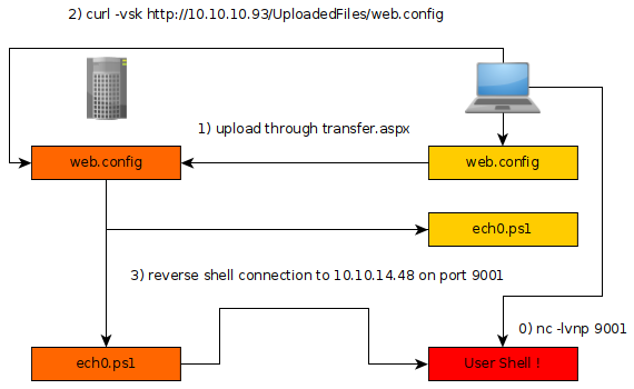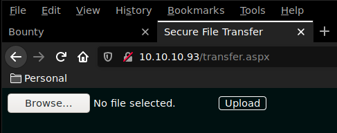 Gobuster seems to have found 2 interesting pages : -/transfer.aspx (which returns a status 200) -/uploadedfiles (which returns a status 301)