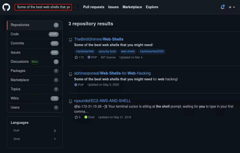As we curl the website's sourcecode, we see a comment 'Some of the best web shells you might need' , if we look for this comment on github we find the following repository: