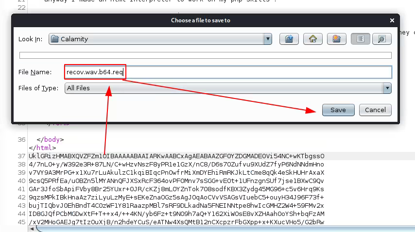 Here we see that there is a file called recov.wav so we get it onto our box using base64 copypasting