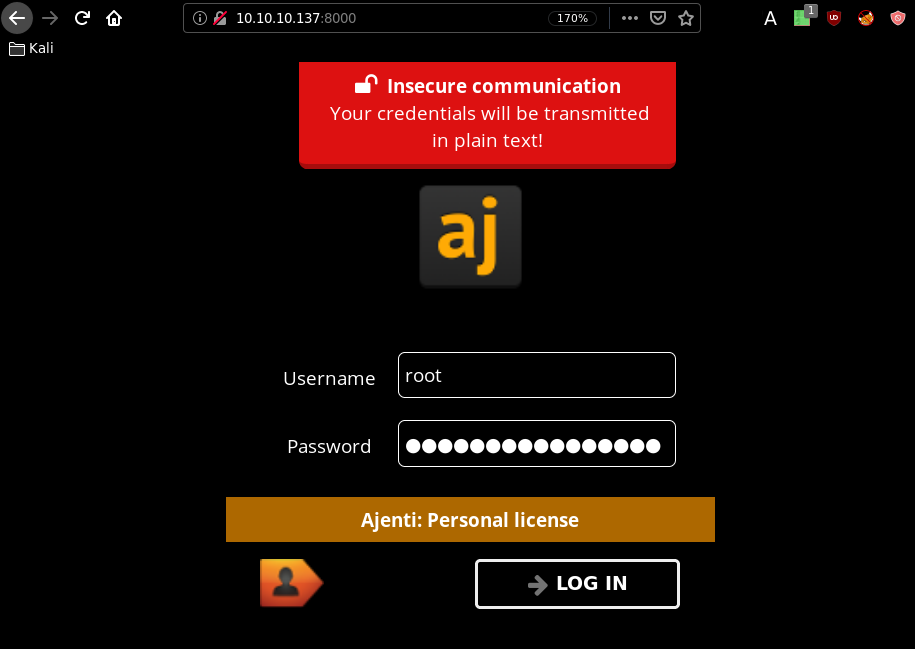 Which reveals us an Ajenti login webpage, and the node.js express framework JSON webapp our nmap scan picked up earlier. so let's investigate with gobuster what lies on the previous port 80: