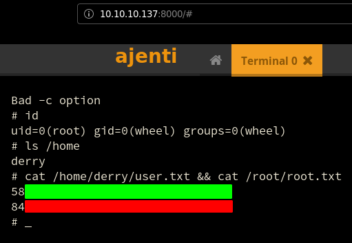 Once logged in we are able to get more information about the box which is a FreeBSD 12.0-RELEASE amd64 machine. From there we simply head over to the terminal tab, from which we can execute commands as the root user, and therefore print out both flags.