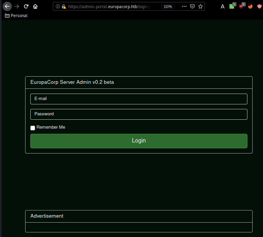 Now we browse to the following link : https://admin-portal.europacorp.htb, and we are greeted with a login page :