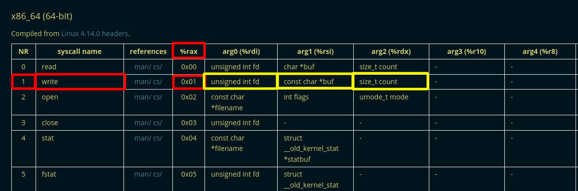 Now we also make use of a systemcall (abbreviated to syscall) which is used when a program requests a service from the kernel. Different Operating Systems mean different Kernels which means different Syscalls, they are not the same depending on the OS. All syscalls have an ID associated with them which is a number. Syscalls also take arguements which are inputs.