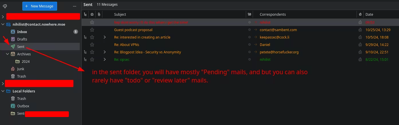 Once all emails are marked properly, you have this result, with visual cues as to what you are waiting for, what you need to do, and what you need to review later: